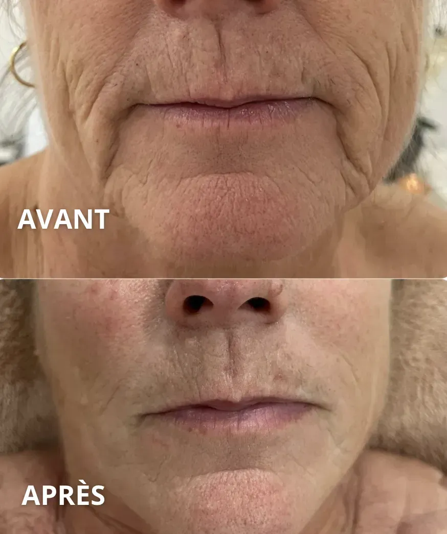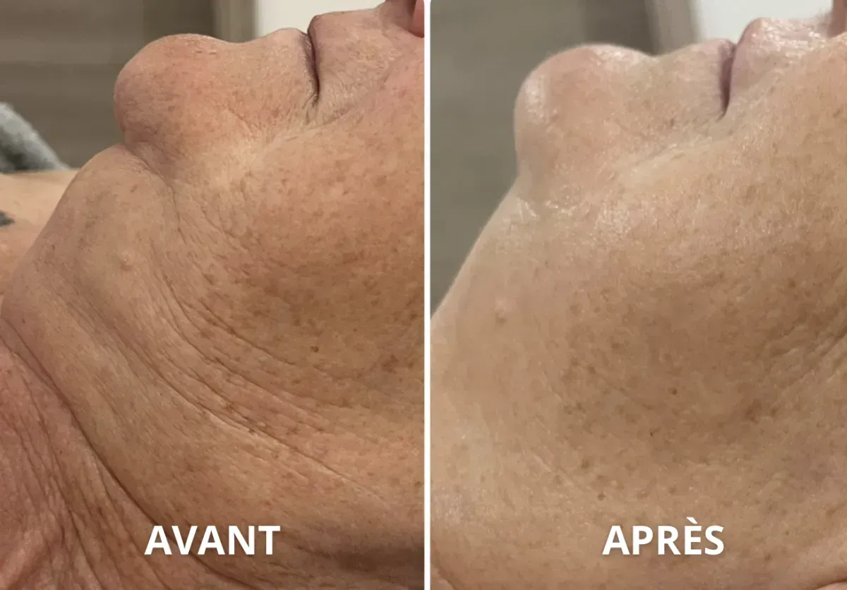 Résultat : une peau plus tendue, lumineuse et visiblement rajeunie, sans aiguille, sans douleur, et avec un effet qui s’améliore séance après séance.